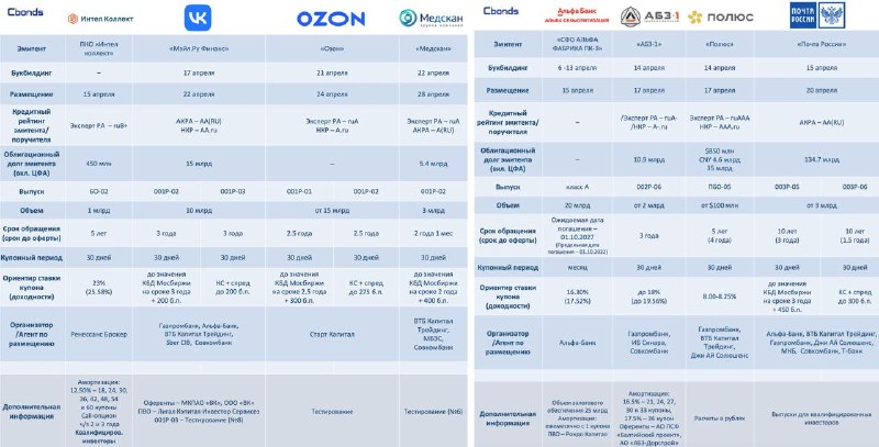 11 апреля автор канала profitanet опубликовал разбор новых выпусков облигаций. В списке предложений мало новых размещений. Автор планирует приобрести облигации Альфа Секьюр, АБЗ (Асфальтобетонный завод №1), Полюс (валютная облигация с доходностью около 8%) и Медскан. Риски по АБЗ связаны с высокой долговой нагрузкой. Валютные облигации составляют около 25% портфеля. Инструменты Озон, ВК, Почта и облигации с рейтингом В автор не рассматривает. Также отмечается возможность покупки старых выпуск...
