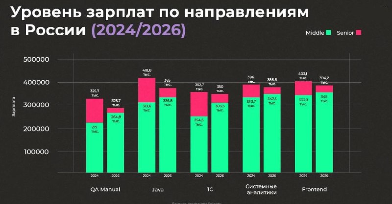 У тестировщиков разрыв сократился более чем в 6 раз: в 2024 году мидл получал 219 тысяч, сеньор — 325 тысяч рублей. В 2026 году — 264 тысячи и 285 тысяч. У Python-разработчиков разница упала в 4 раза. В аналитике и frontend разрыв составляет 1,5–2 раза.